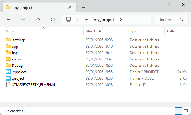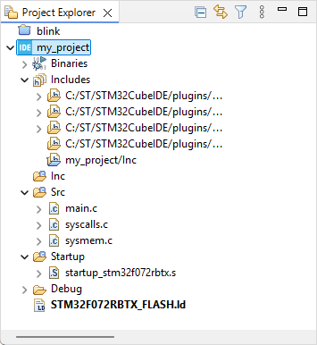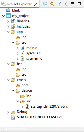 The first steps are the same as for the 1.2. Hello World tutorial. You can repeat the operations of section #1 "Creating a new project" without any changes, except the name you provide for the project. Let's replace "blink" by "my_project".