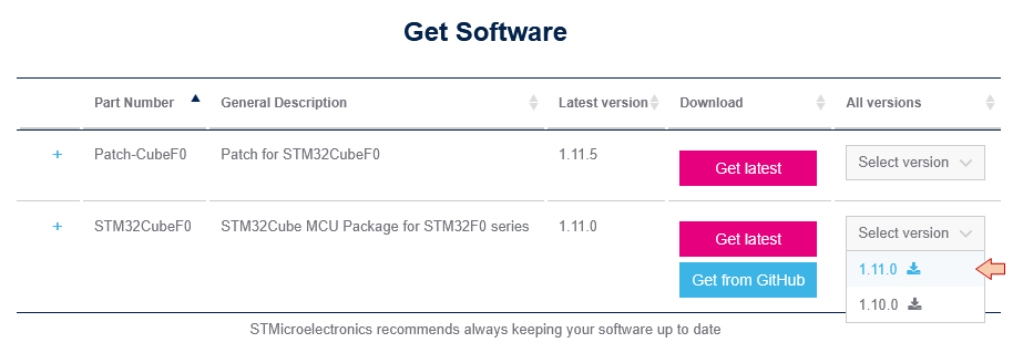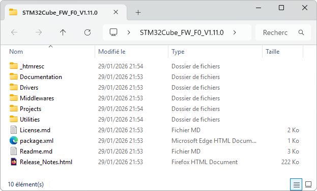 In order to get up-to-date CMSIS source files, a good option is to download the latest release of STM32 Cube libraries for the targeted device familly (STM32F0 here). It comes as a pretty big package including HAL libraries, but do not worry, we will only pick-up few files from this package.