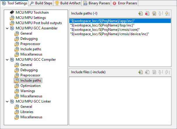 In the MCU/MPU GCC Compiler, Include paths section, you must provide paths to all the header files (.h) in your project. In our example, we have (or will have) headers in: