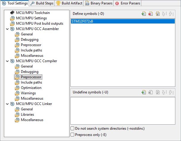 Go back to project properties, under C/C++ Build→Settings, and open the MCU/MPU GCC Compiler, Preprocessor section. In the Define symbols area, start by removing