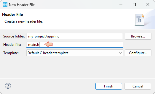 , add a new header main.h to the /app/inc folder. Select the Default C header template and click Finish.