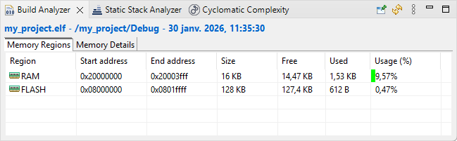 arm-none-eabi-size my_project.elf arm-none-eabi-objdump -h -S my_project.elf > "my_project.list" text data bss dec hex filename 612 0 1568 2180 884 my_project.elf Finished building: default.size.stdout Finished building: my_project.list 11:35:31 Build Finished. 0 errors, 0 warnings. (took 3s.292ms)Have a look on the Build Analyzer and check memory levels: