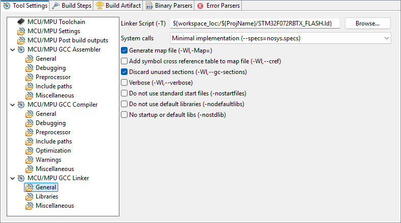In the MCU/MPU GCC Linker, General section, review the path to your Linker Script (just as we did in the "Hello World" tutorial):