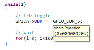 GPIOA->ODR ^= GPIO_ODR_5;which is exactly same code, as there are just a #define behind GPIOA, ODR, GPIO_ODR_5 labels. Still, it makes code writing and reading way more comfortable. When hovering the mouse over a defined symbol, you get a bubble info that provides the definition: