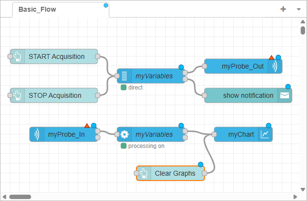 Looking at the flow chart, the different nodes display a status signaling that connection and processing is now effective.