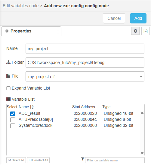 In the next form, fill in the Name and Folder fields. The folder is your project \Debug folder, which contains the my_project.elf executable file. When completed, the software should display the my_project.elf file using the File dropdown list. When selected, the Variable List updates and let you choose which variables you want to monitor. Just select ADC_result.