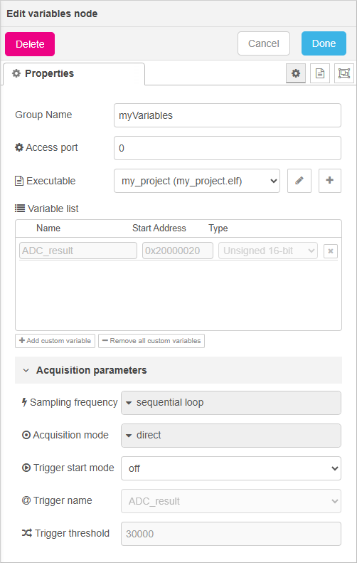 The Edit variables node form updates and the Variable list is now populated with the variables you've selected for monitoring. You can further set Acquisition parameters. Here we choose to sample data as fast as possible (sequential loop).