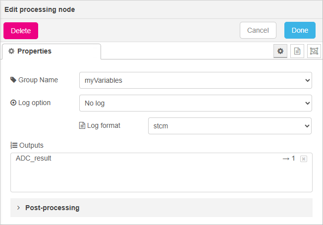 block. Review the settings. Note that ADC_result is routed to output #1 which is connected to the Chart block in the flow chart.