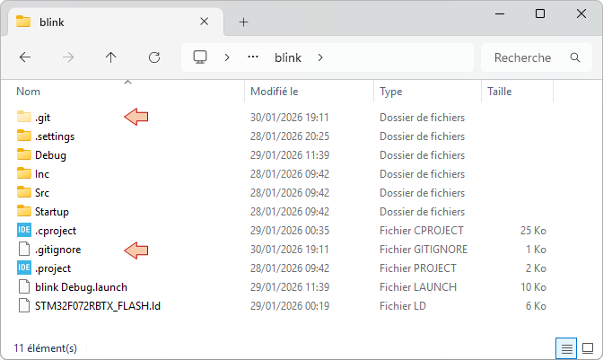 If you take a look into the project folder, you will notice that a new \.git folder has appeared. It is your local repository. There's also a .gitignore file that is new. This file contains a list of directories and files which are not concerned by Git tracking. Basically, you'll find here the \Debug project folder that contains no source code, and is re-generated each time you build the project. Do not edit the .gitignore file.