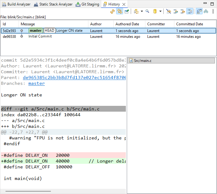 Select the Slower blinking link for detailed review. You'll see all the changes this commit holds, just like within STM32CubeIDE: