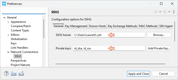 Wherever you store your SSH keys, you need to tell Eclipse where it is. For this, from the main menu select Window→Preferences, and select the General, Network Connections, SSH2 category. Then provide the path to your keys in the SSH2 Home field, and make sure that Private keys field include the id_rsa filename.